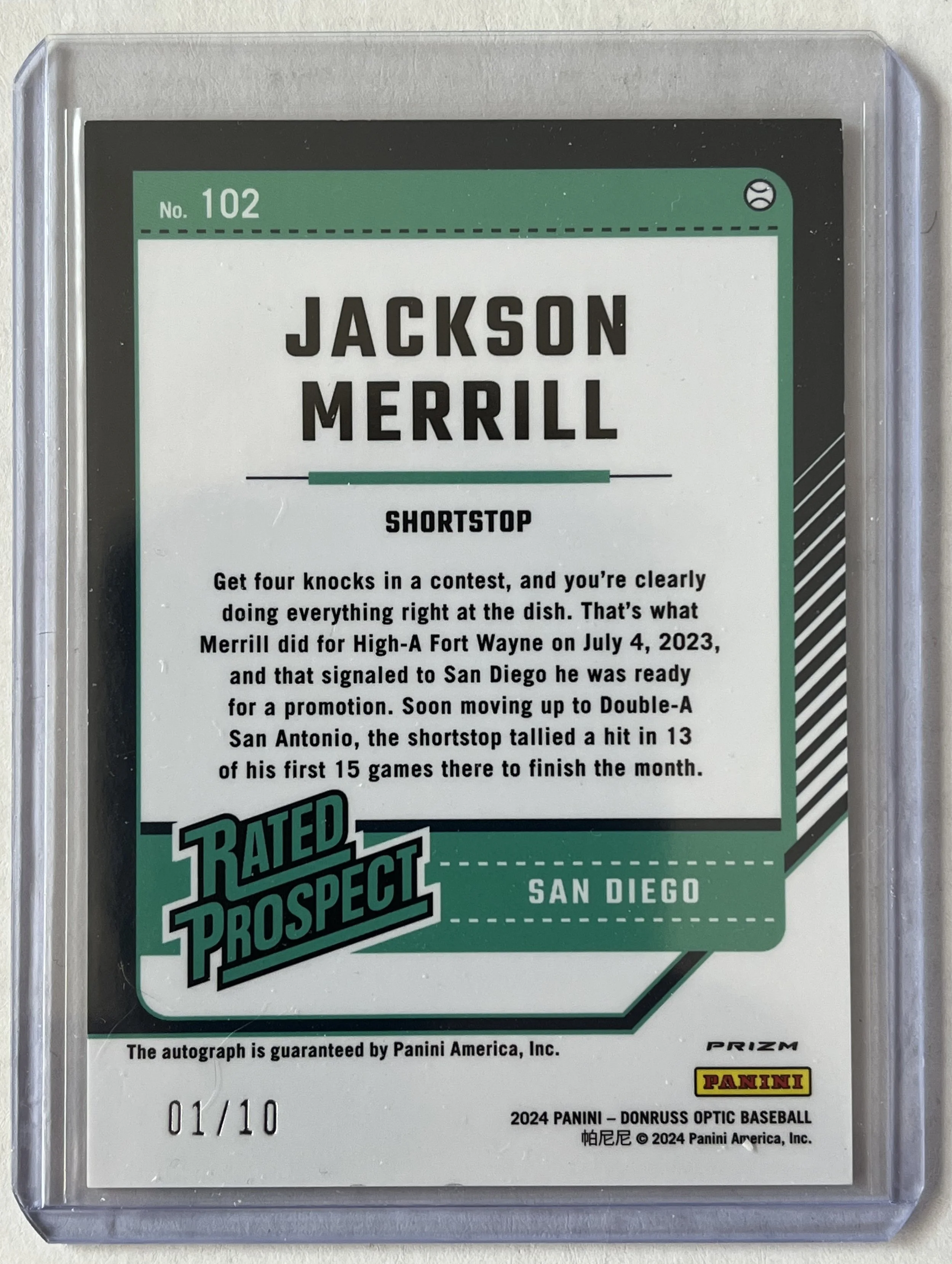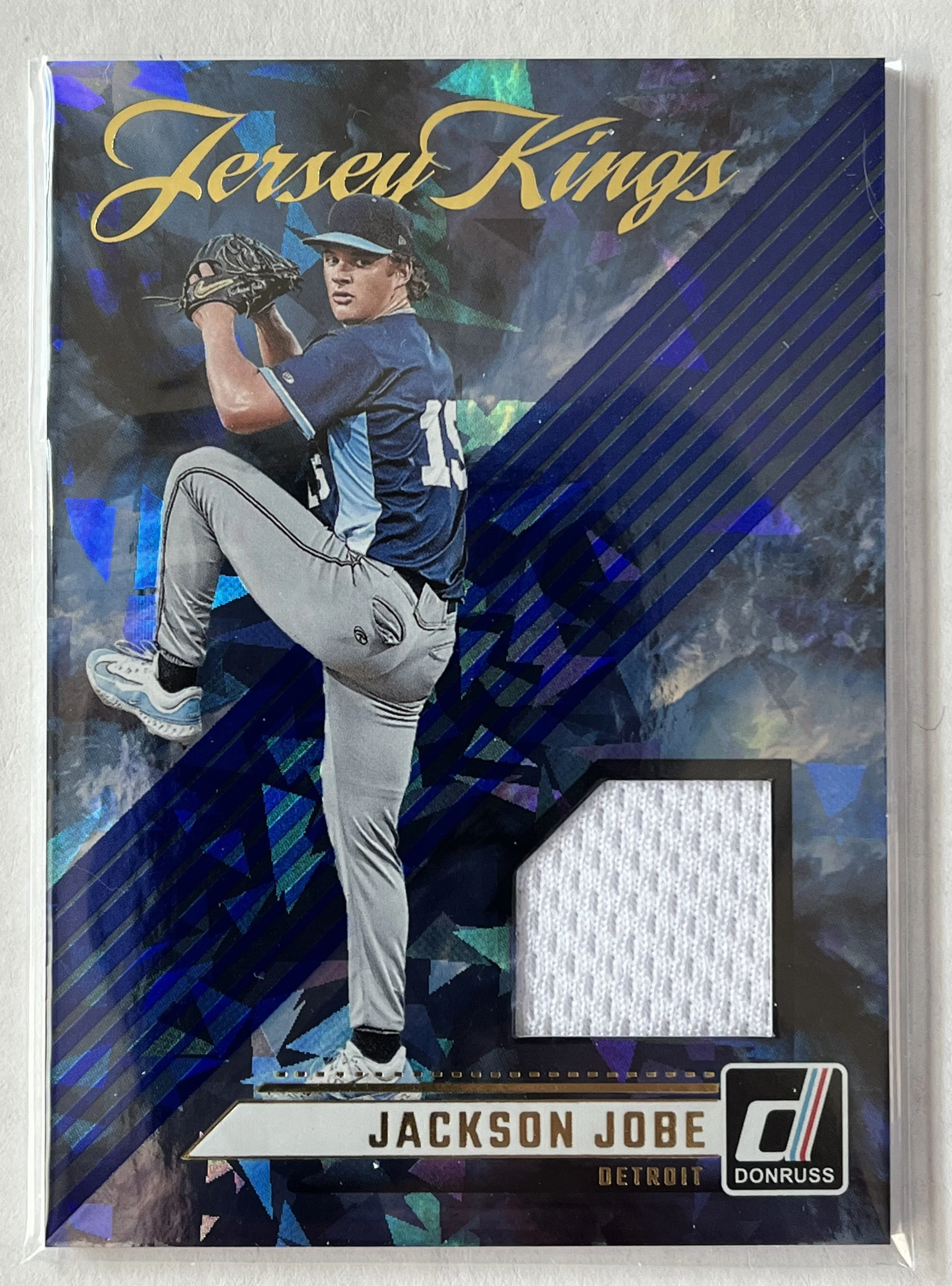 Each Mega Box is said to contain 2 memorabilia or autograph cards on average. I was able to pull both an autograph and a memorabilia card in this box. The memorabilia card was a Jackson Jobe Jersey King Blue Ice Parallel. The autograph was a Jackson Merrill Rated Prospect Optic Signature Gold Velocity Prizm (#01/10)!