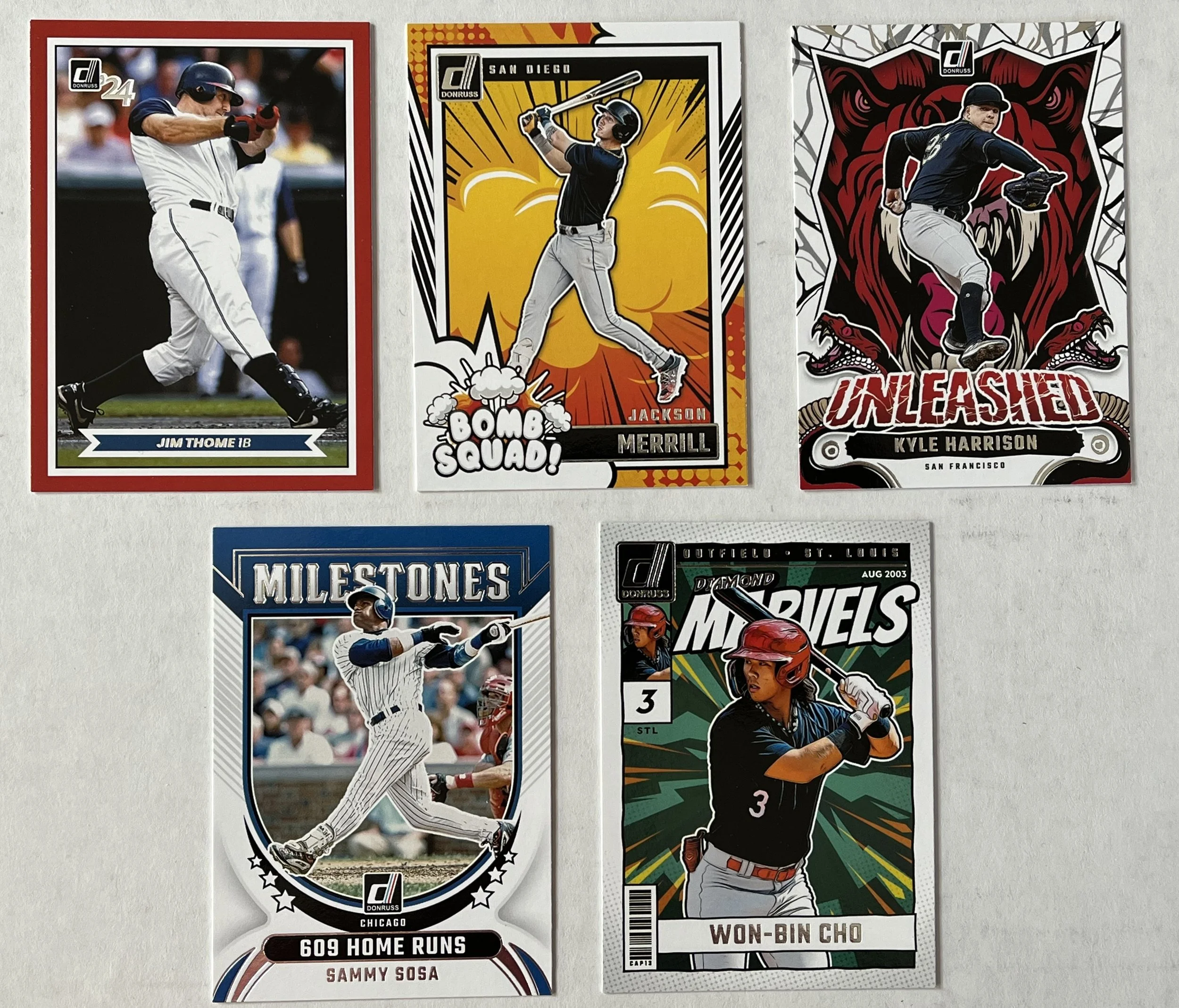 There are eight insert sets in 2024 Donruss. The more common ones are Action All-Stars, Bomb Squad, Milestones and Unleashed. Case hits include Whammy and Career Retrospectives.