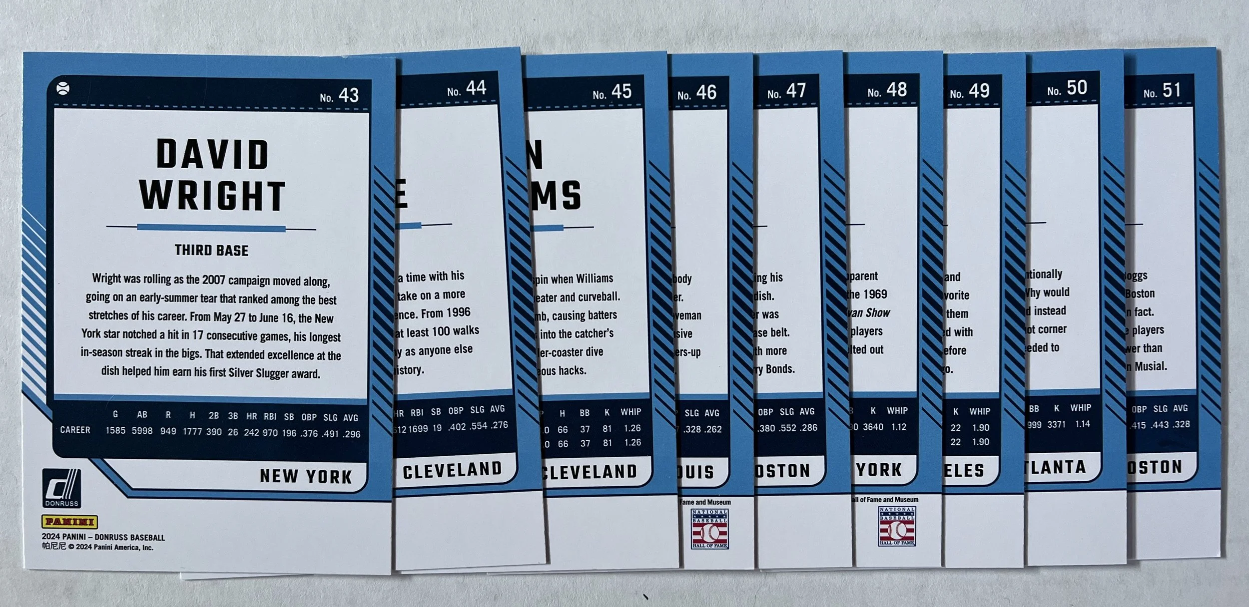 Donruss is back in 2024 with a 200 card base set that focuses on retired stars and prospects. The first 100 cards feature many Hall of Famers, past All-Stars and up and coming prospects. The second 100 cards showcase the Rated Prospects, the best that the Minor Leagues have to offer..