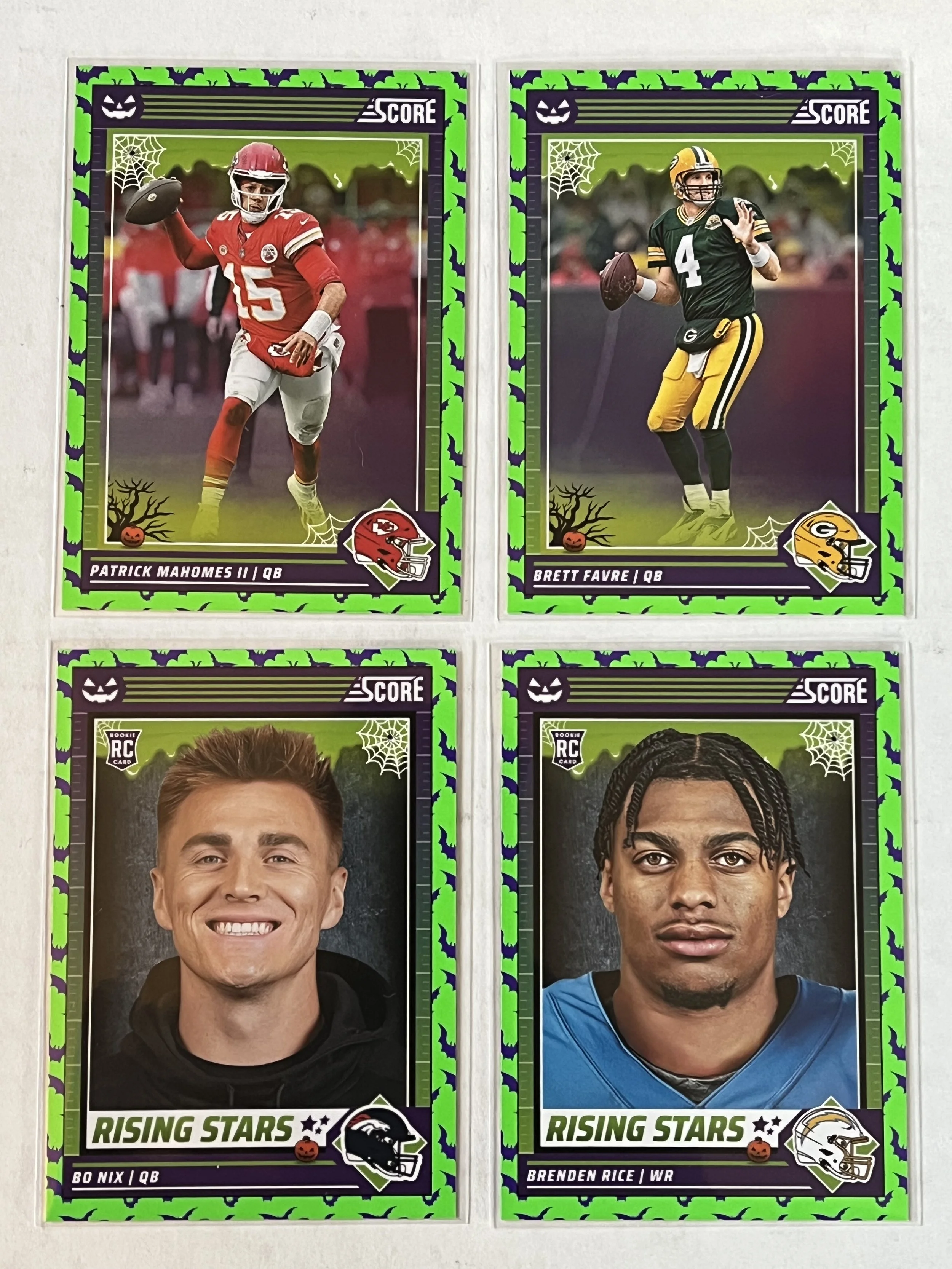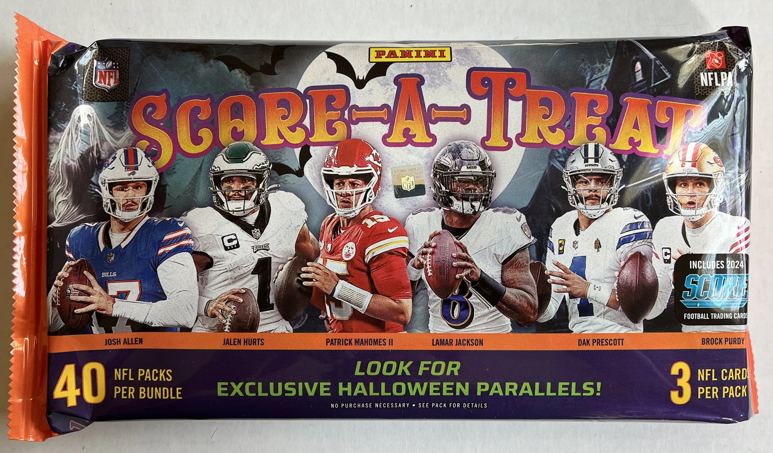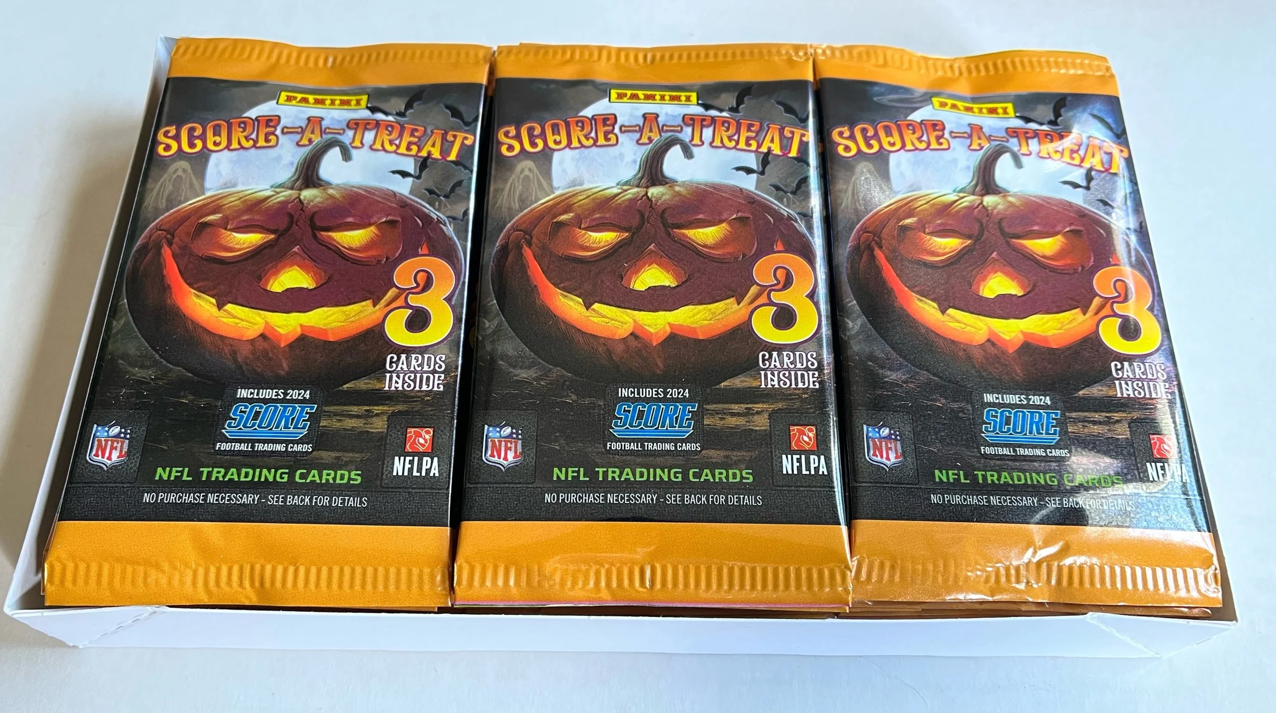 The 2024 NFL season is near and the first release featuring the new rookie class is 2024 Score. However, this is not your usual Score Football set. This is the Halloween version of the set, called Score-a-Treat. This set is sold in 40 pack bundles with 3 cards per pack. Each card is a Halloween Parallel. There are 2 base parallels: Orange Pumpkin and Green Bats.