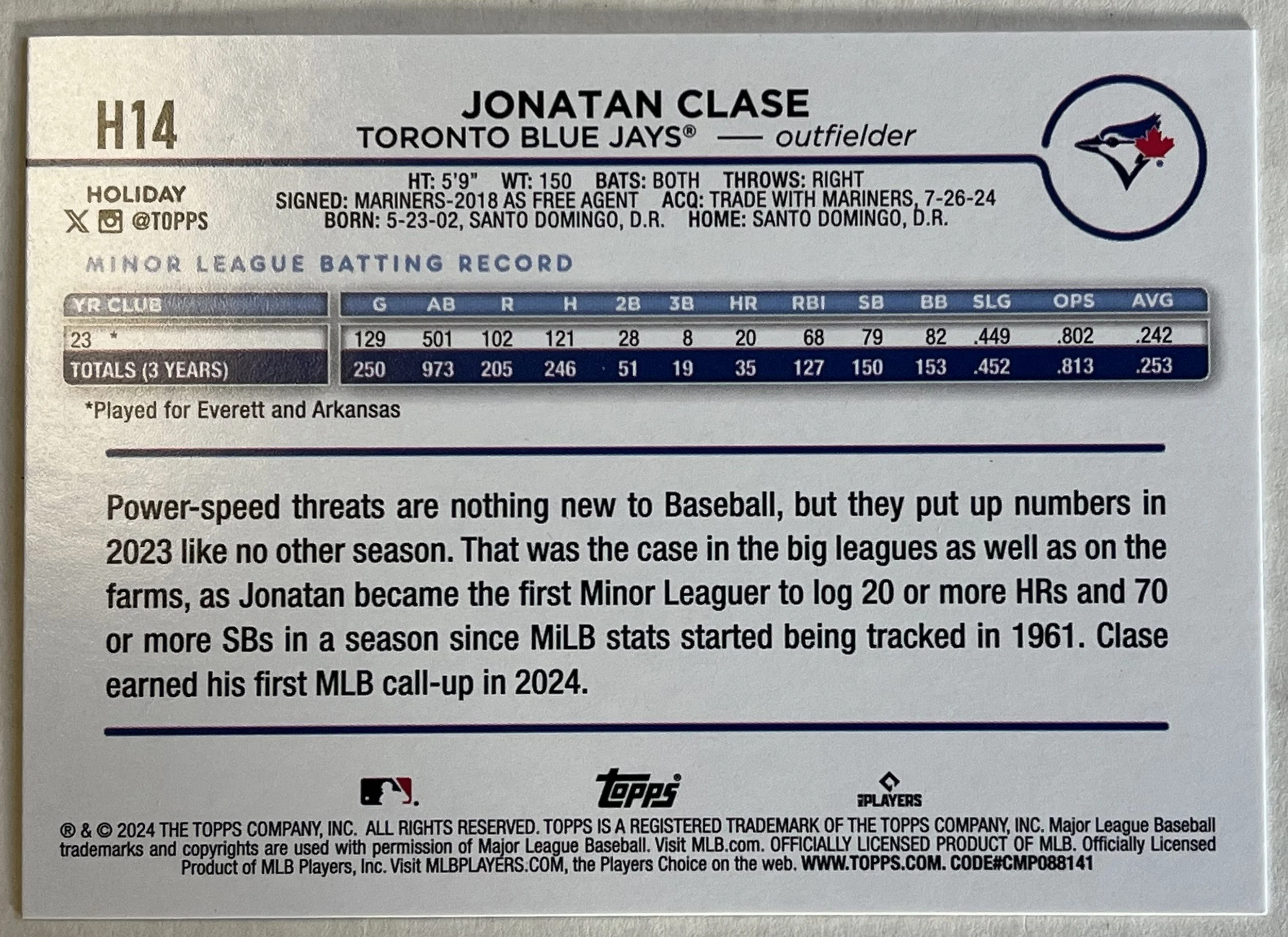 One interesting side note, card number H14 Jonatan Clase. The front of the card uses the same photo as his Update and shows him with the Mariners. The back of the card shows him with his new team, the Toronto Blue Jays.