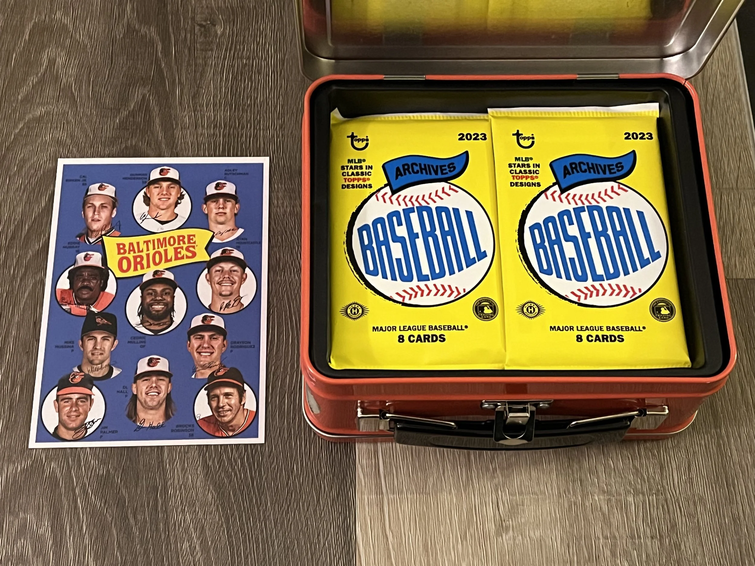 Upon opening the lunch box you will find the oversized box loader placed on top. The ten packs are securely shipped in a plastic tray. In my box I pulled a Baltimore Orioles box loader.