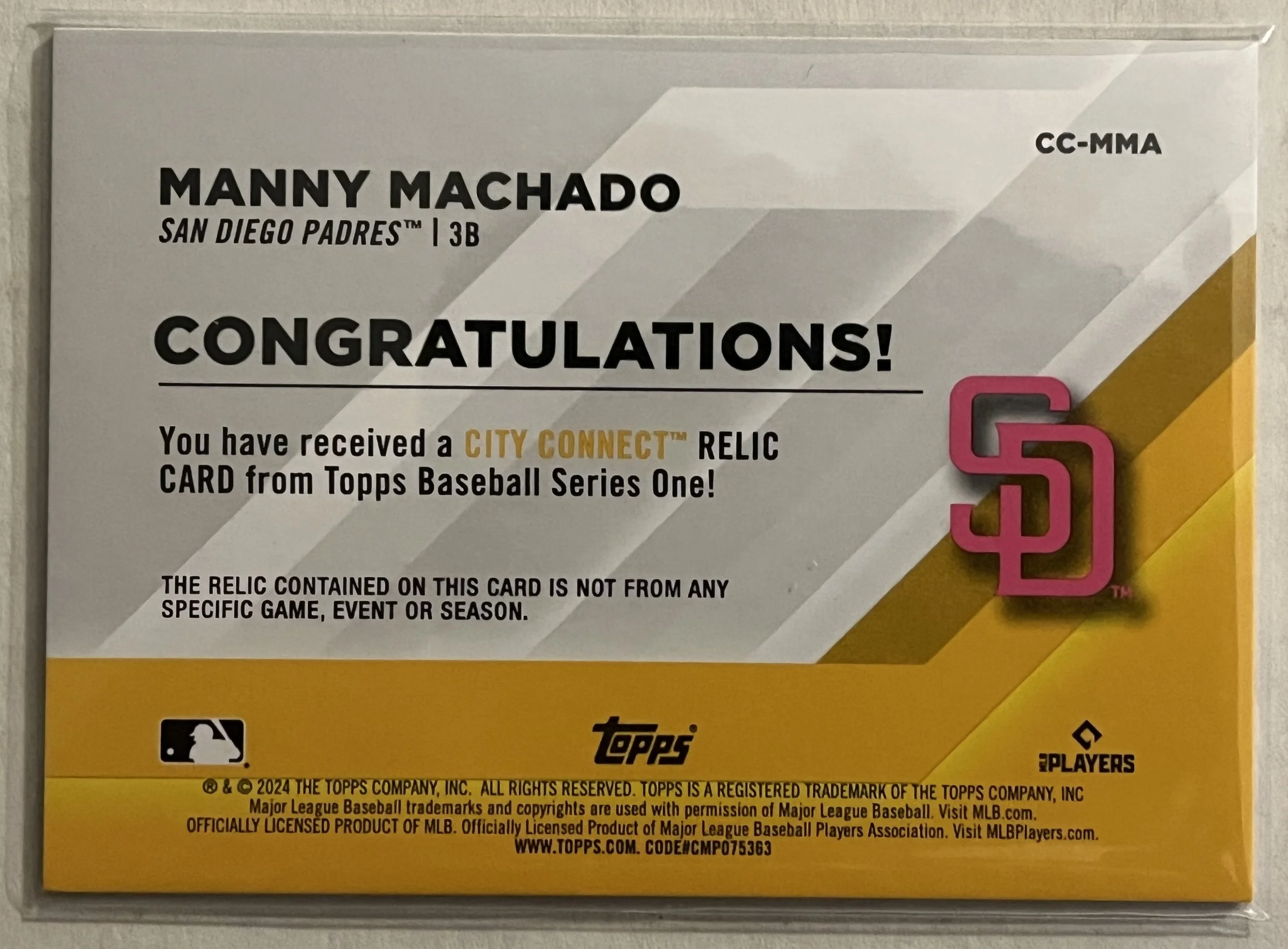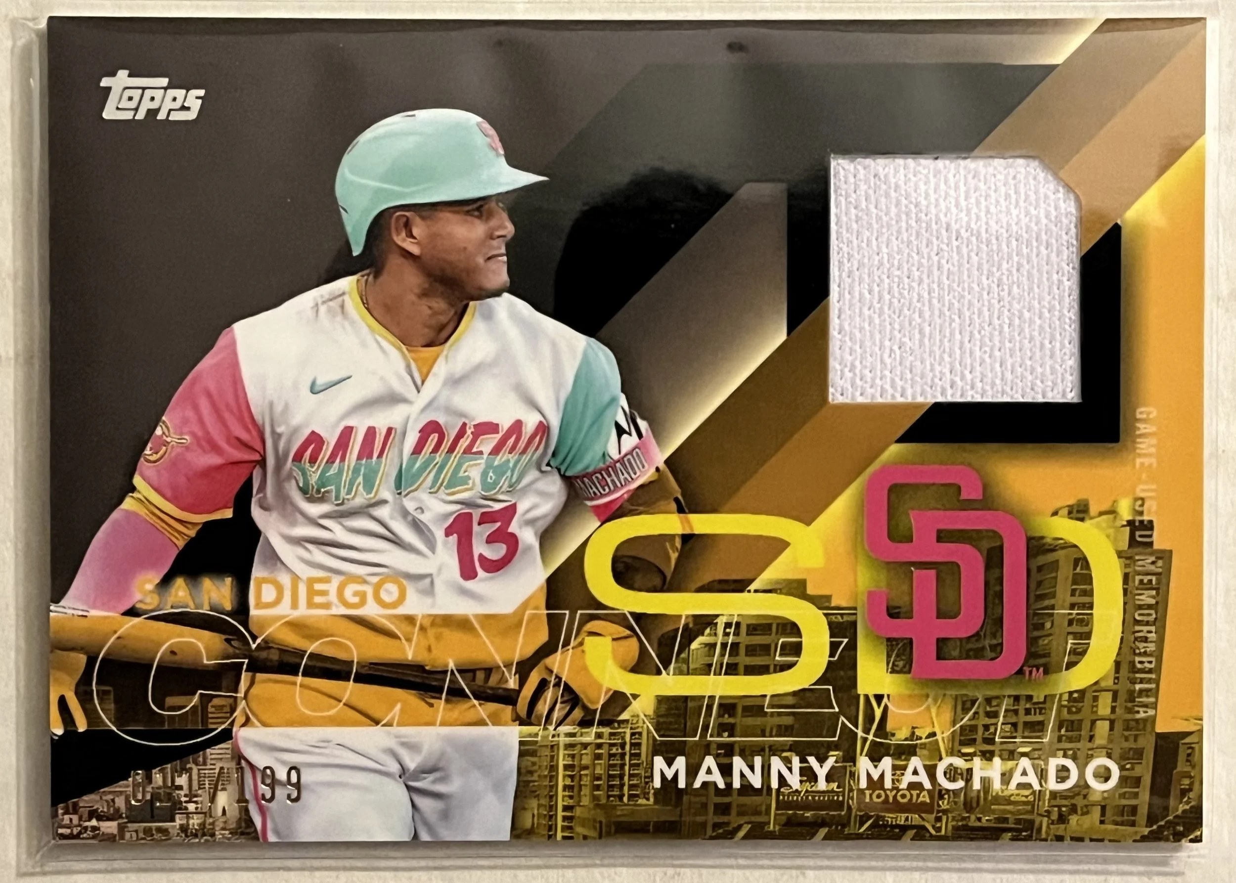 Each hobby box contains one guaranteed hit. This hit will either be a relic or autograph card. In my box I got a Manny Machado City Connect relic black parallel numbered 011/199.