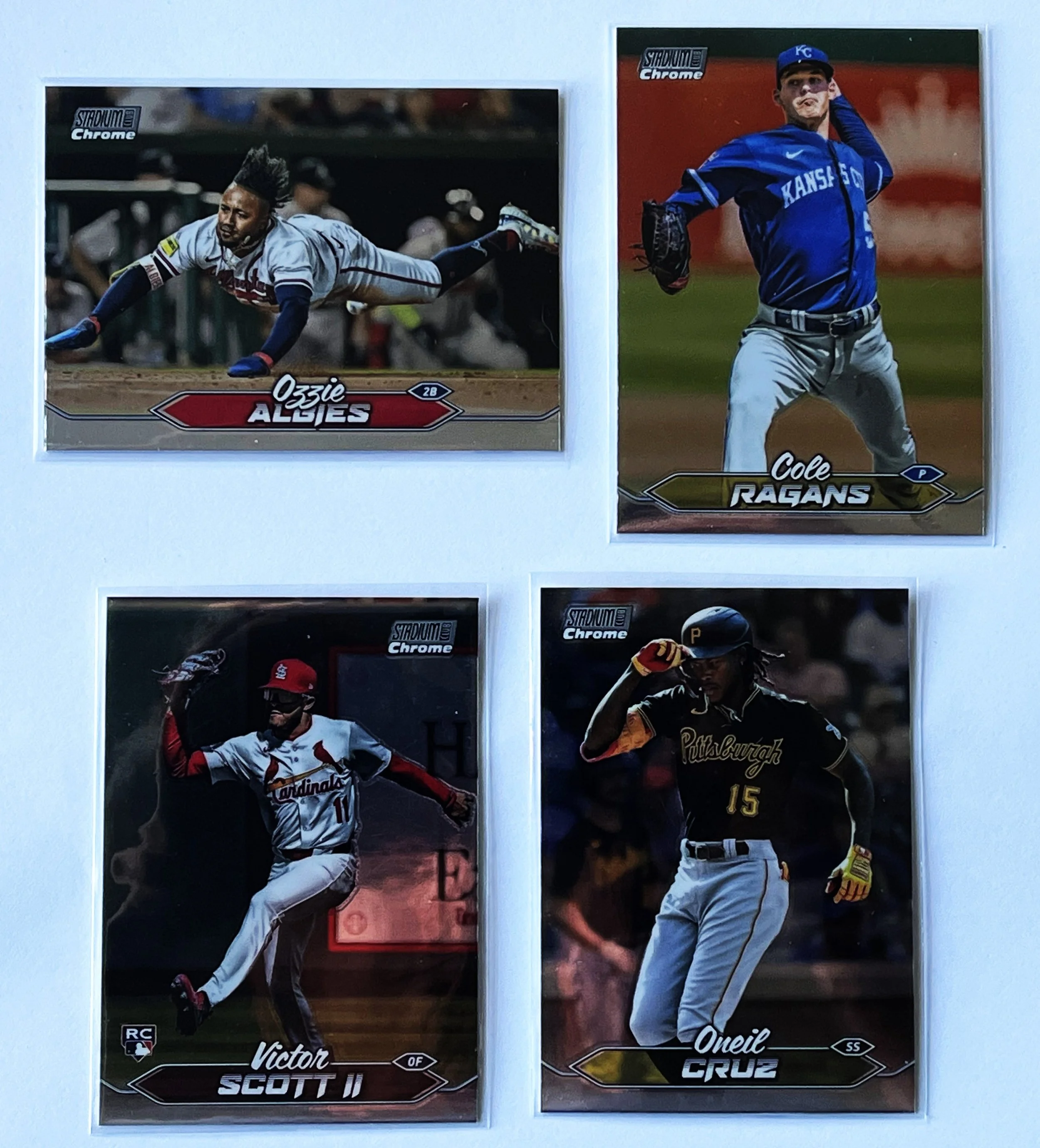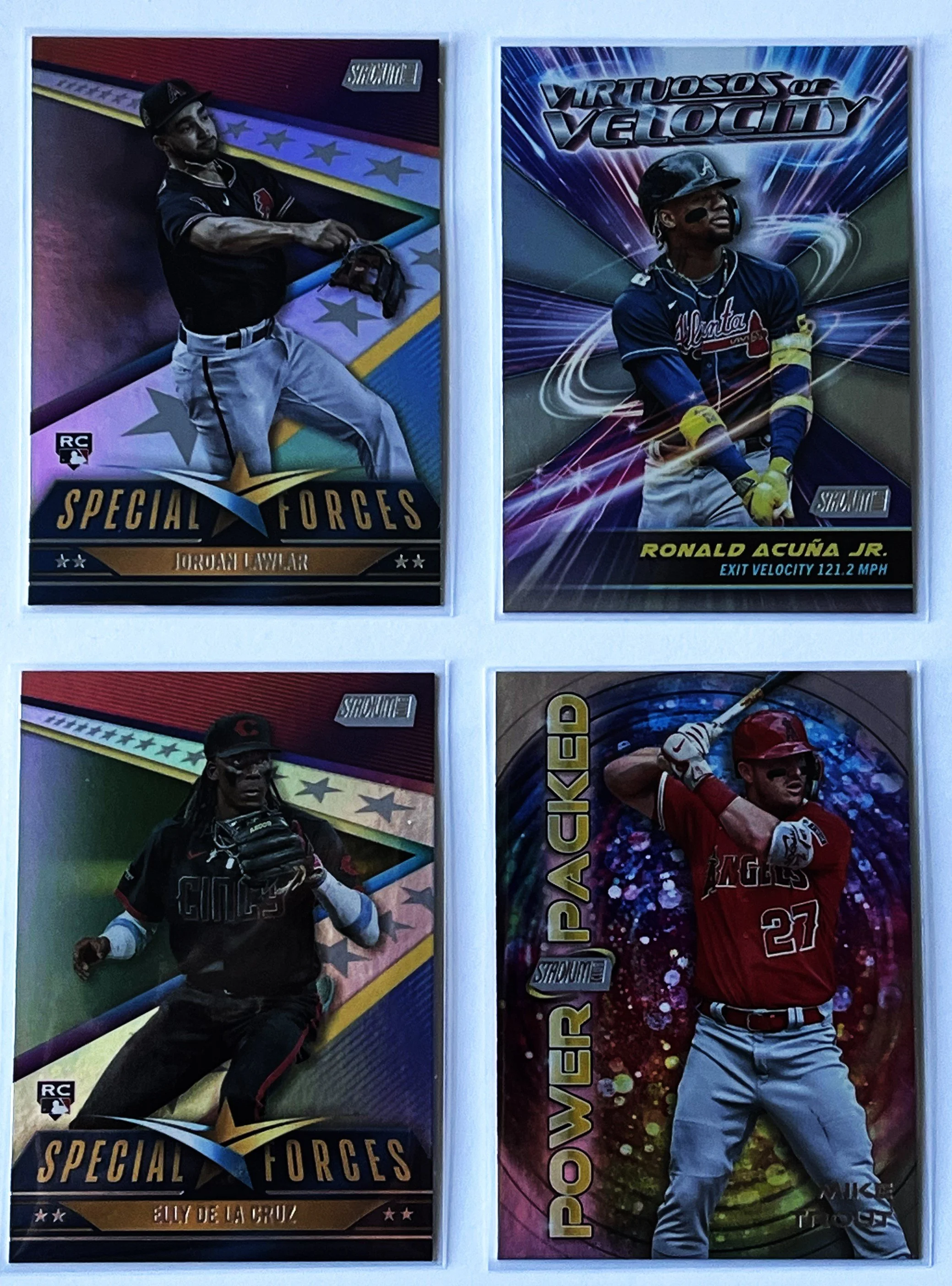 As advertised I pulled at least 2 inserts in each blaster. There were 2 Special Forces inserts, Jordan Lawlar and Elly De La Cruz. There was also an Acuna Jr Virtuosos of Velocity and a Trout Power Packed. In the second blaster I get a 3rd insert card. It was a Triumvirates Nicknames insert of Willie Mays. These inserts are 1 in every 97 packs.